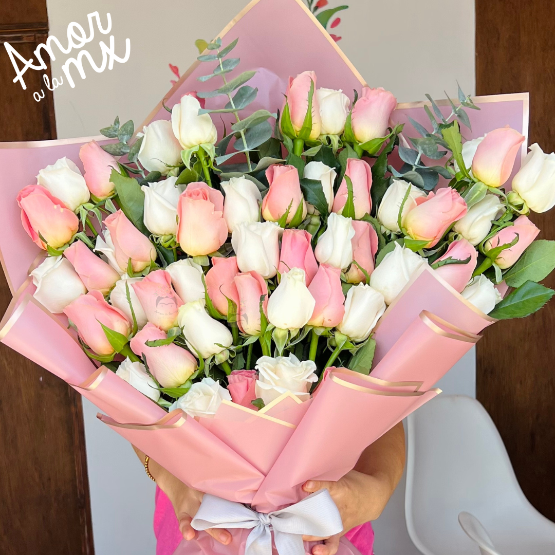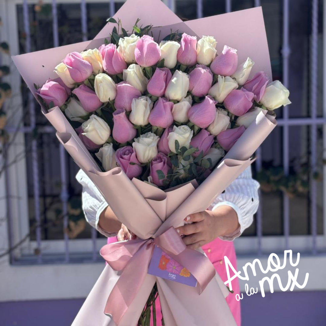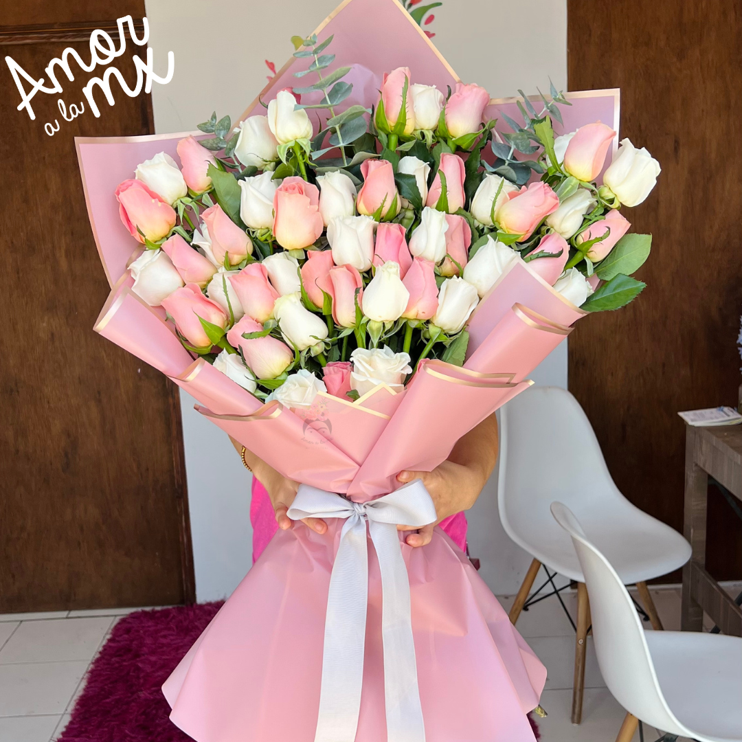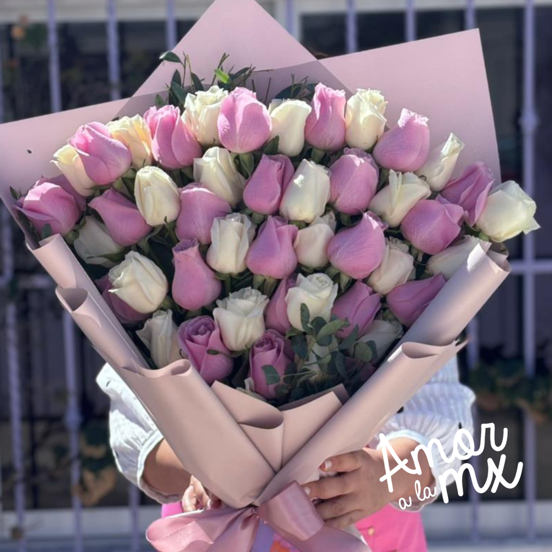 Bellisimo ramo vertical de 50 rosas con follaje envuelto en papel decorativo, Follaje disponible en tienda.
