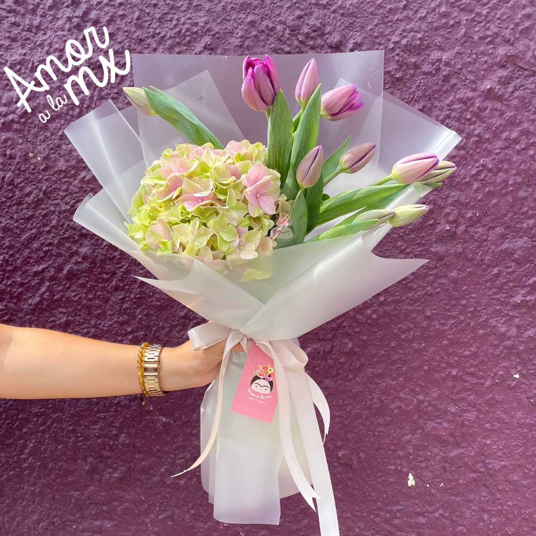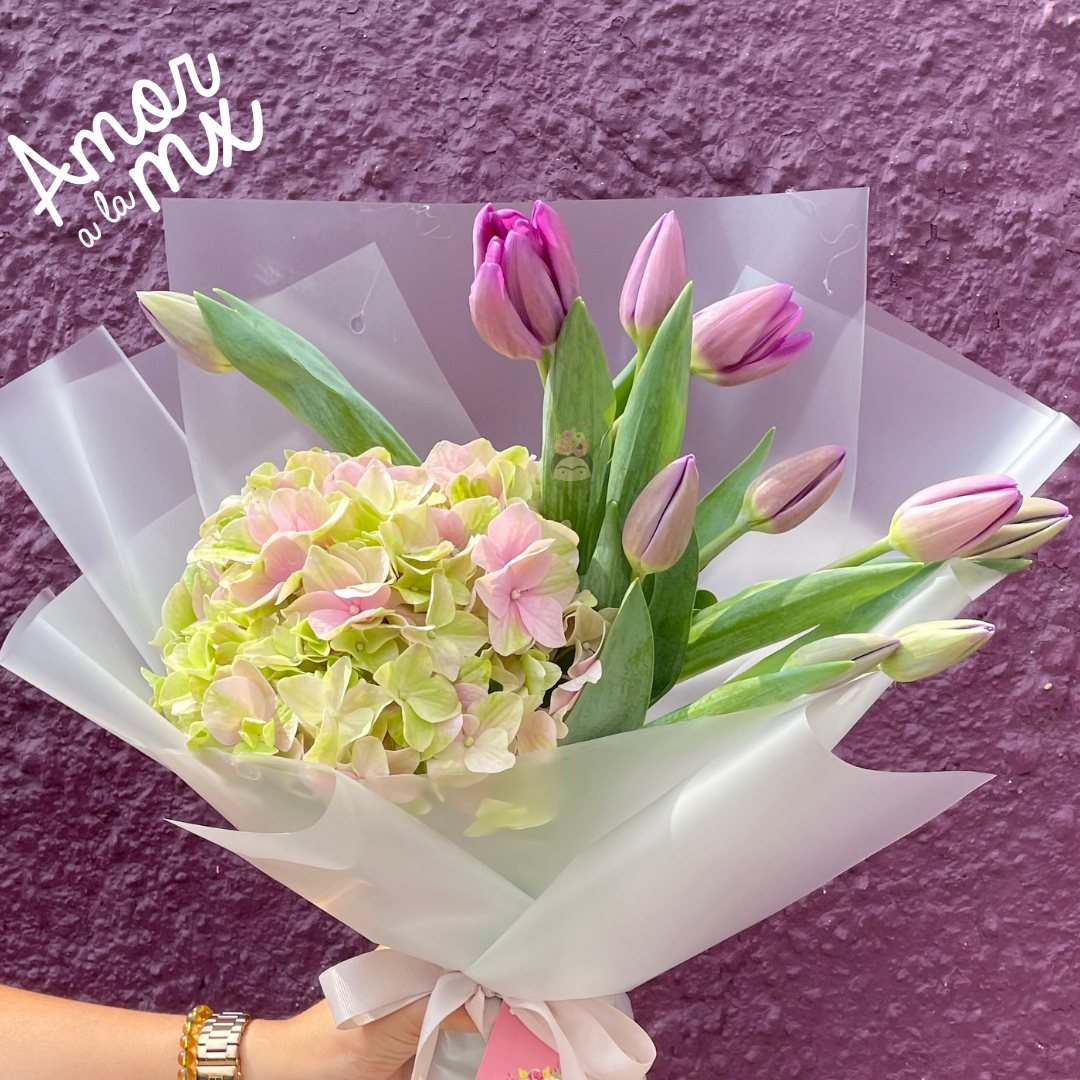 Ramo de 10 tulipanes con hortensia, envuelto en papel decorativo