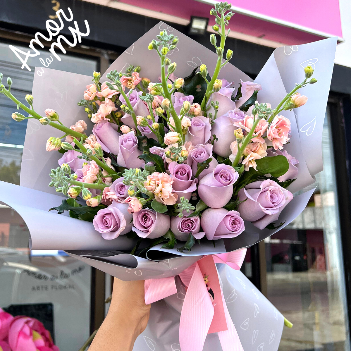 Ramo redondo de 25 rosas con matiolas envuelto en papel decorativo.