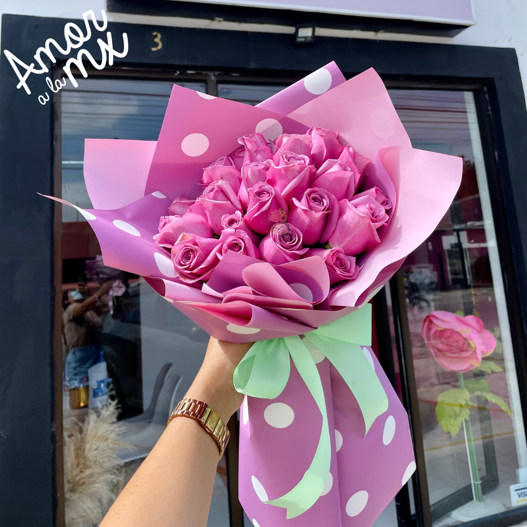 Ramo redondo de 25 rosas envuelto en papel decorativo