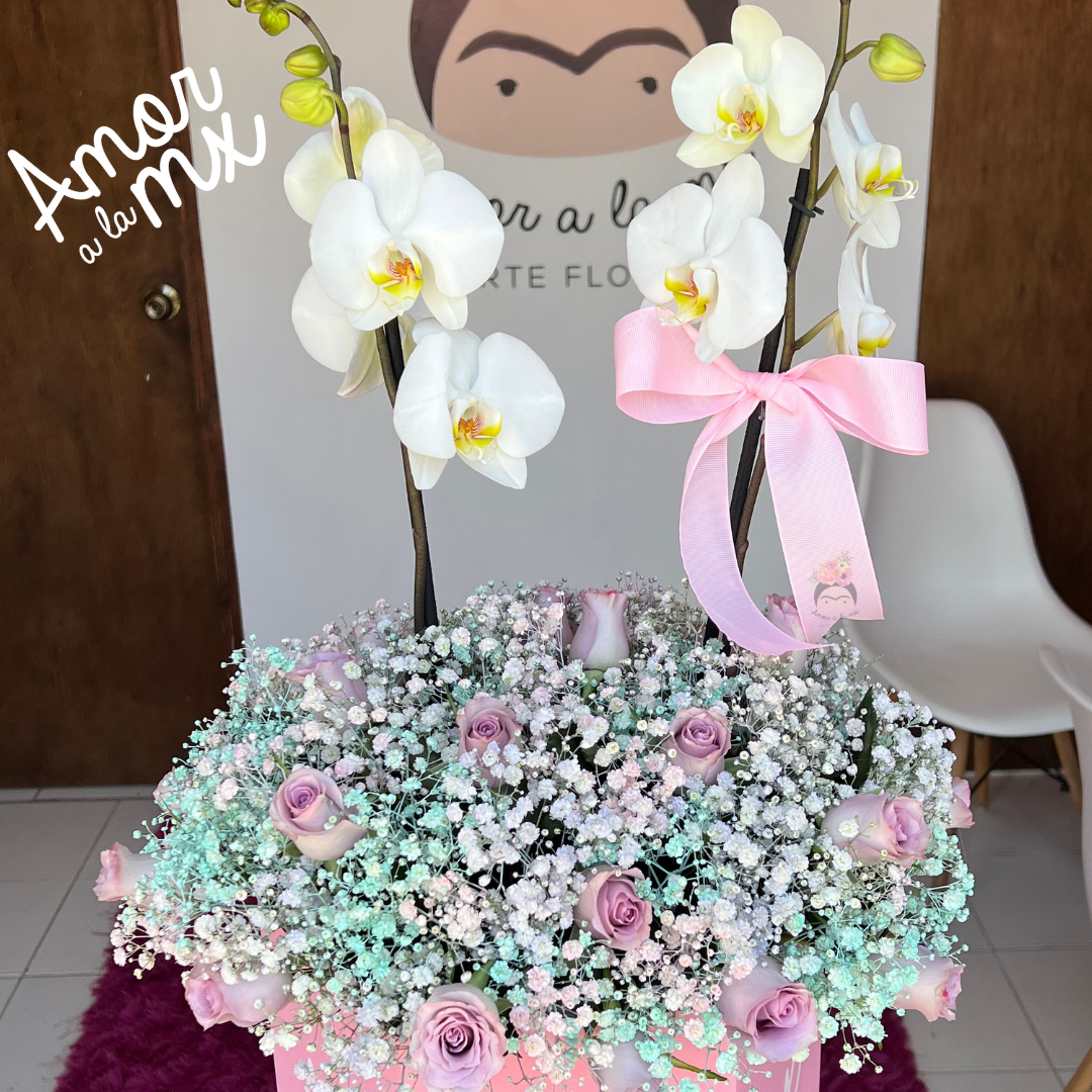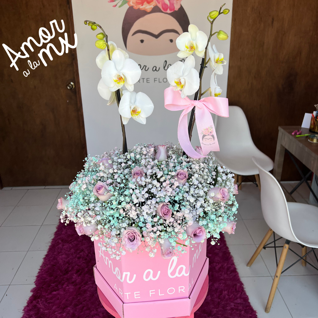 Caja hexagonal de rosas y gypsophila con orquídea en vara.