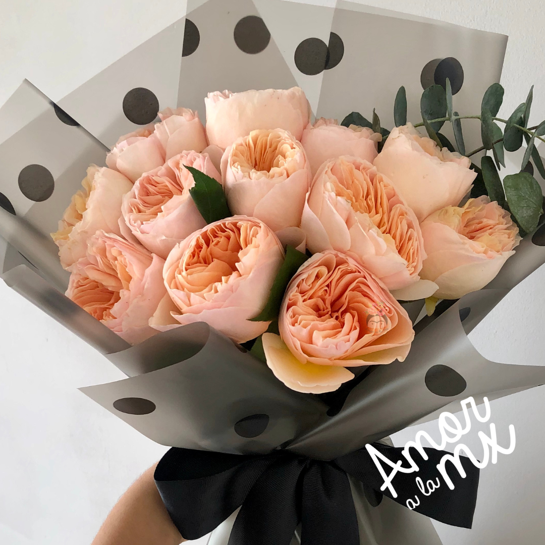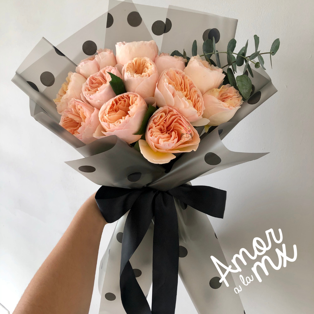 Ramo de 10 rosa inglesas, envueltas en papel decorativo.