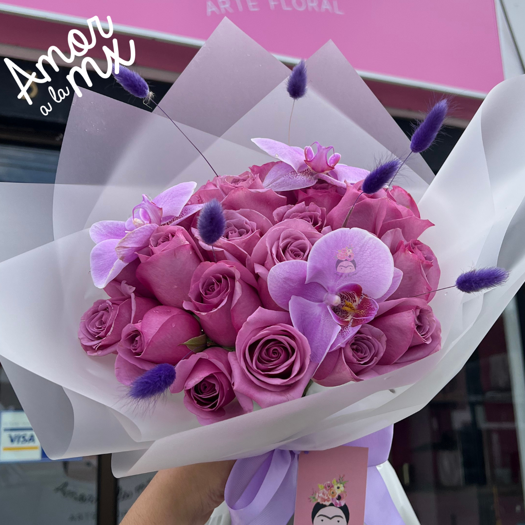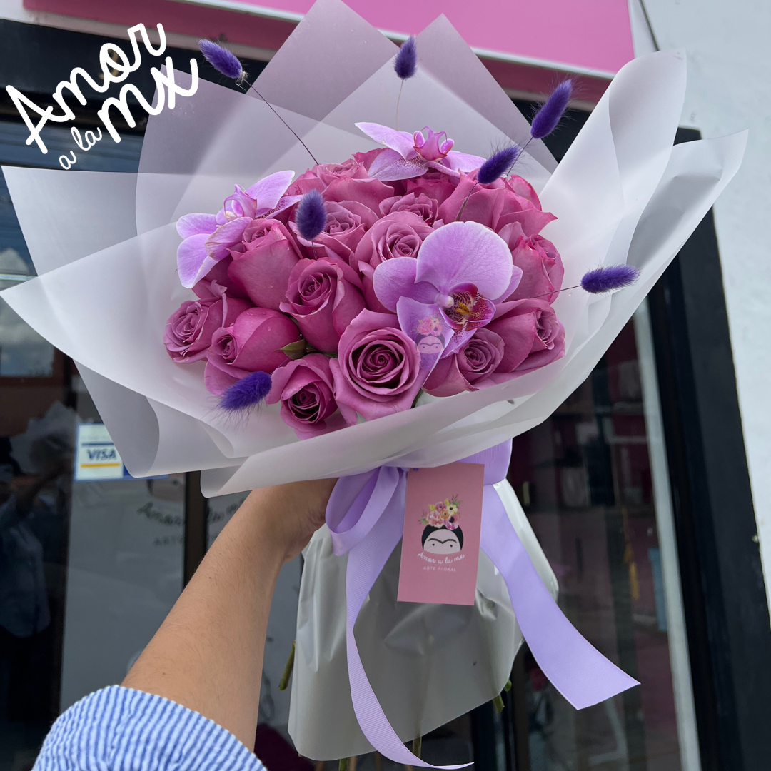 Ramo de 25 rosas redondo con orquídeas junto con follajes preservados, envueltas en papel decorativo.