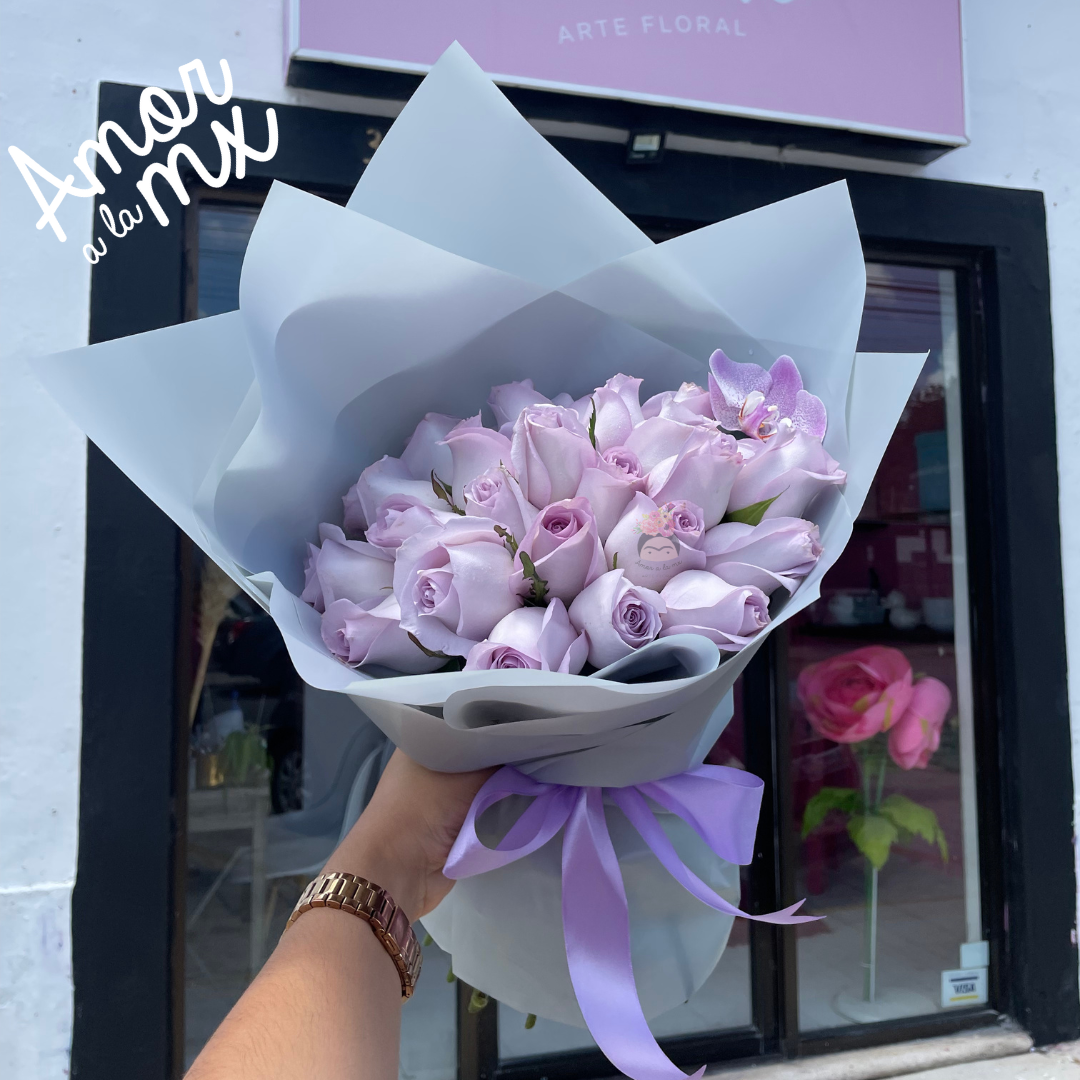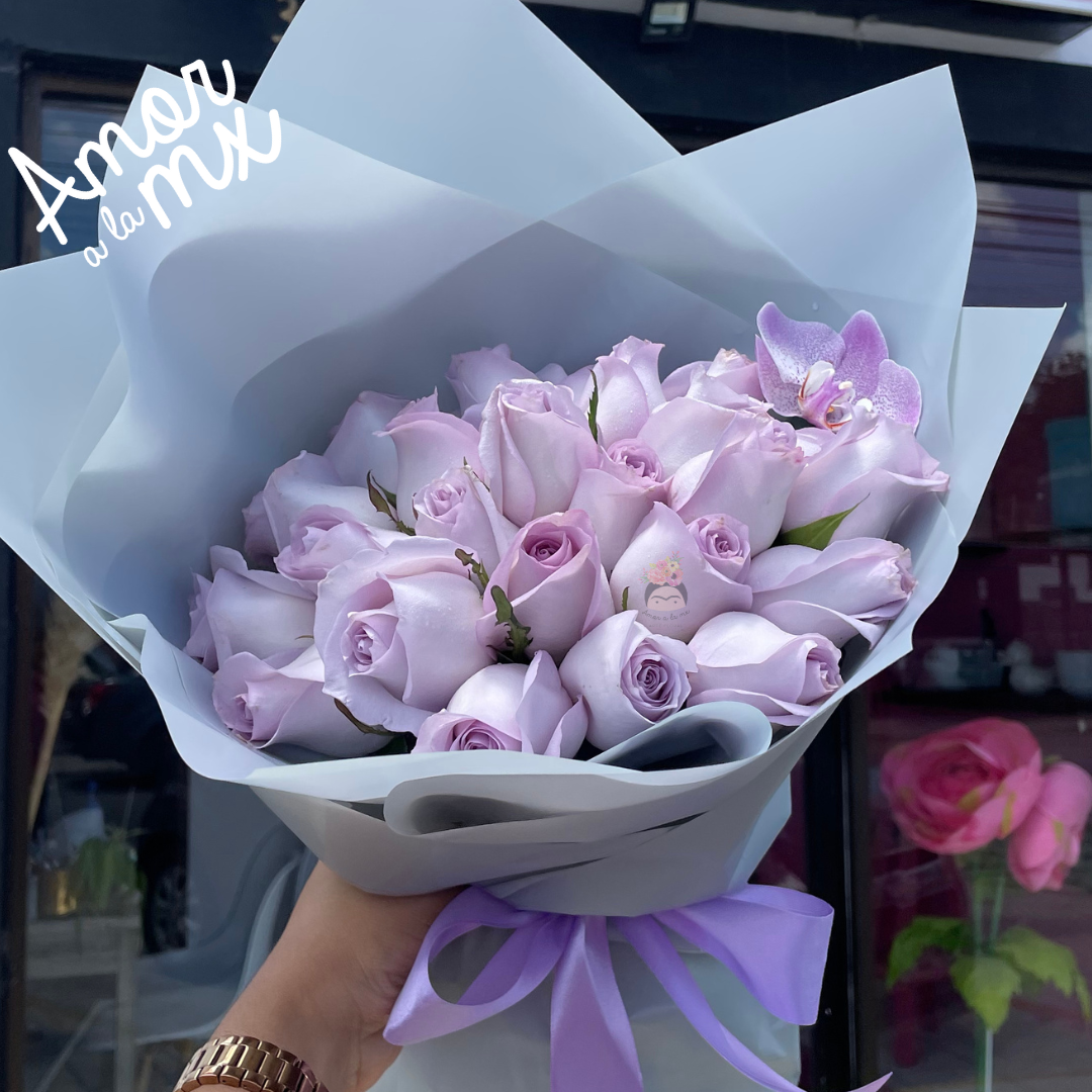 Ramo de 25 rosas redondo con 1 orquídea, envuelto el papel decorativo.