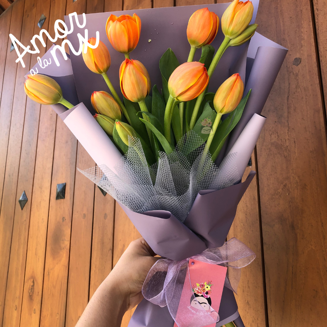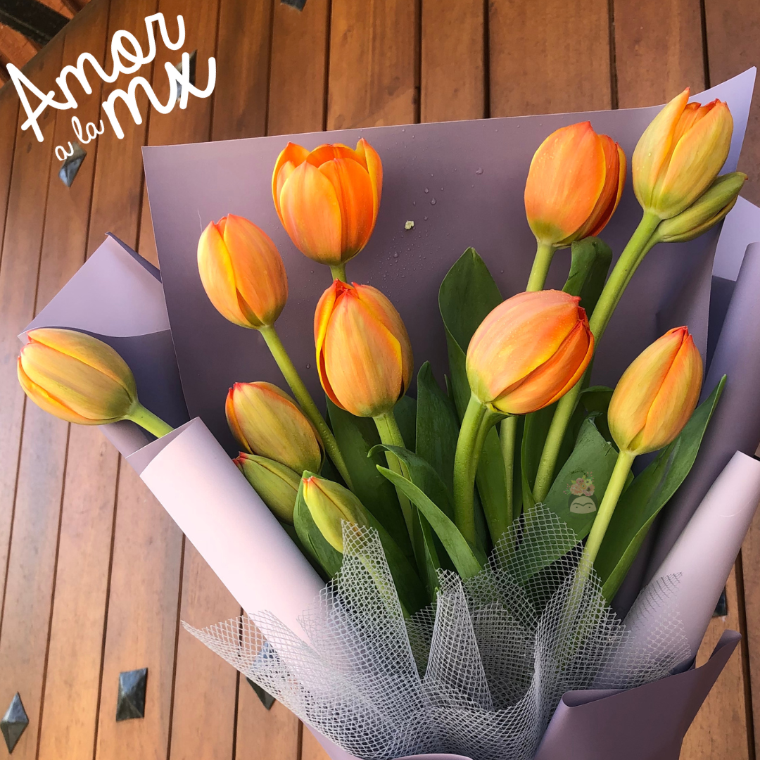 Ramo de 10 tulipanes envuelto en papel decorativo.