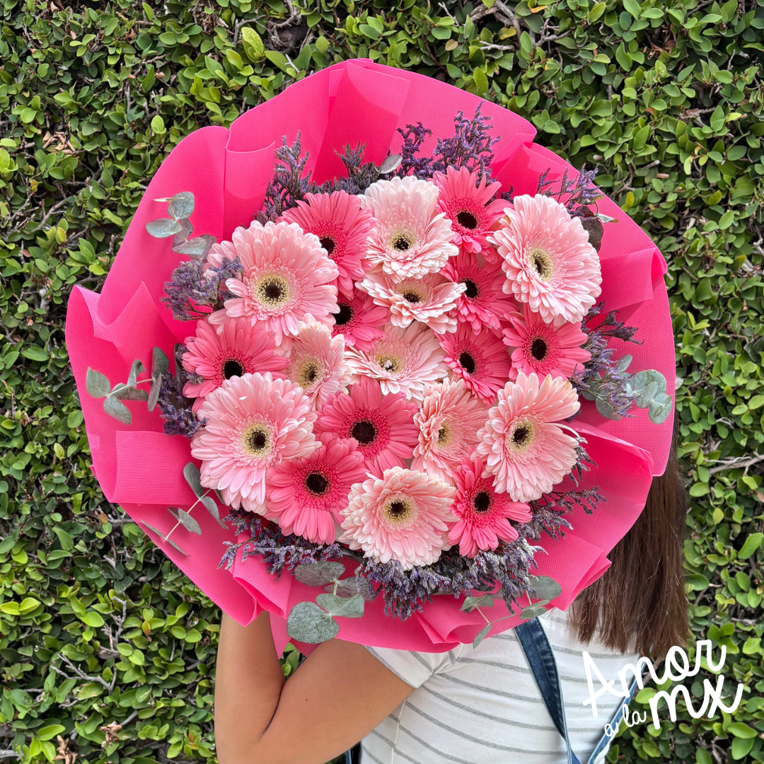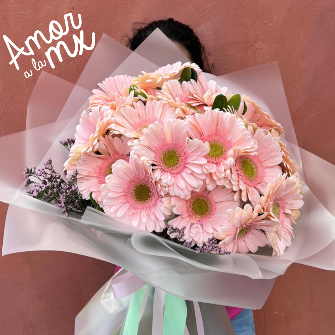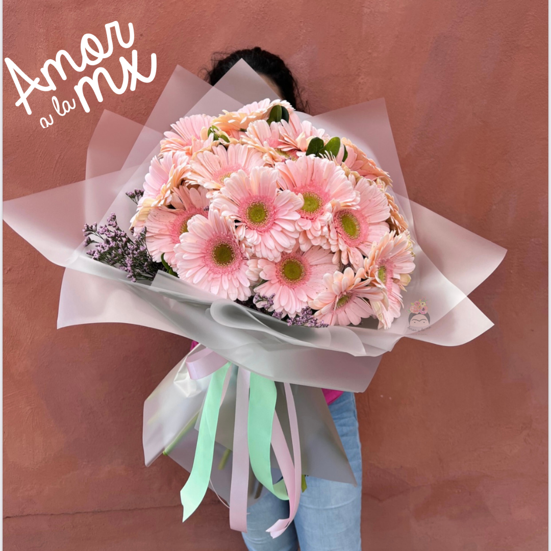 Ramo redondo de 20 gerberas con follaje disponible en tienda envuelto en papel decorativo.