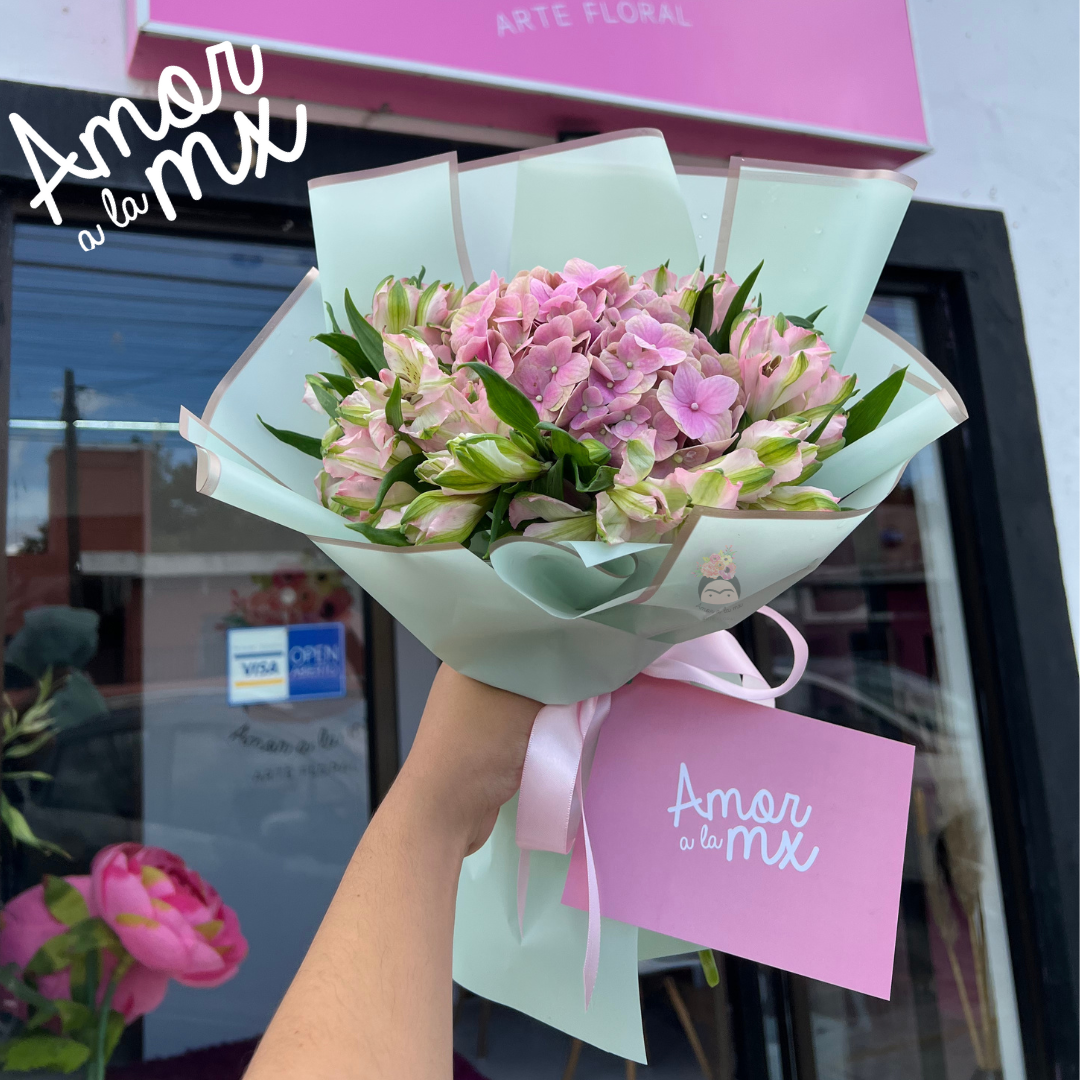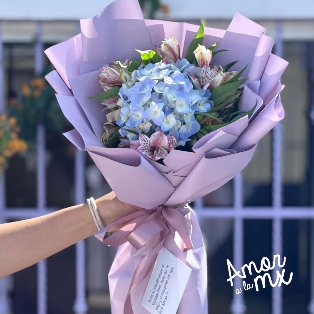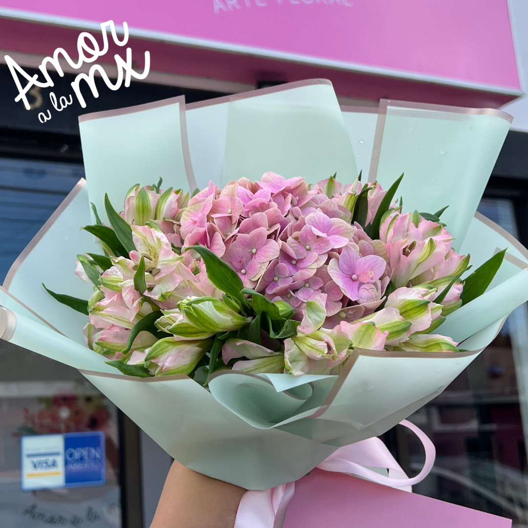 Hermoso ramo 1 de hortensia y astromelias, envuelto de papel decorativo.