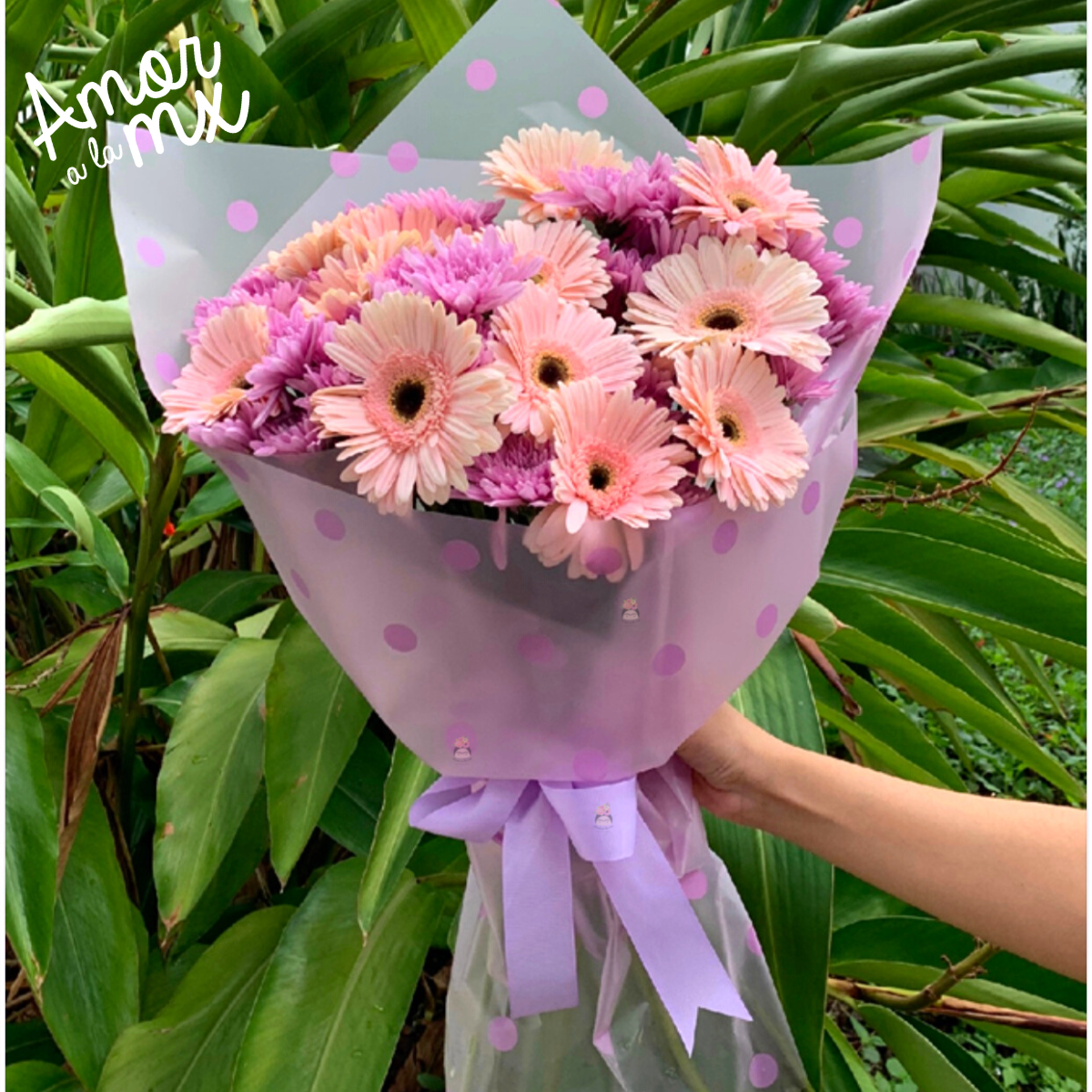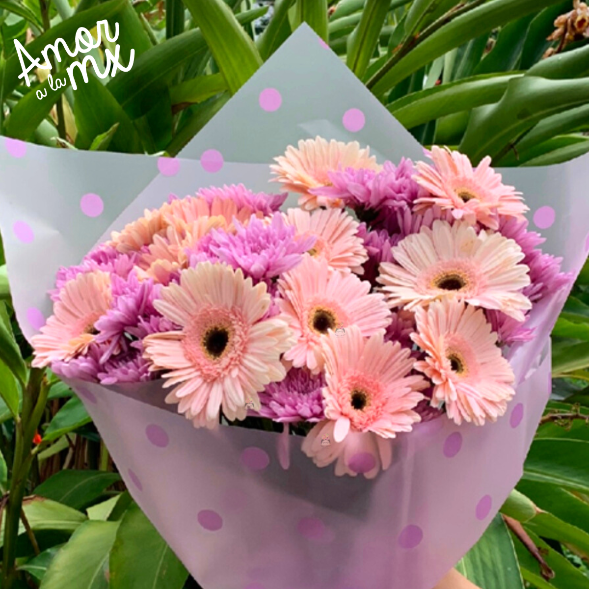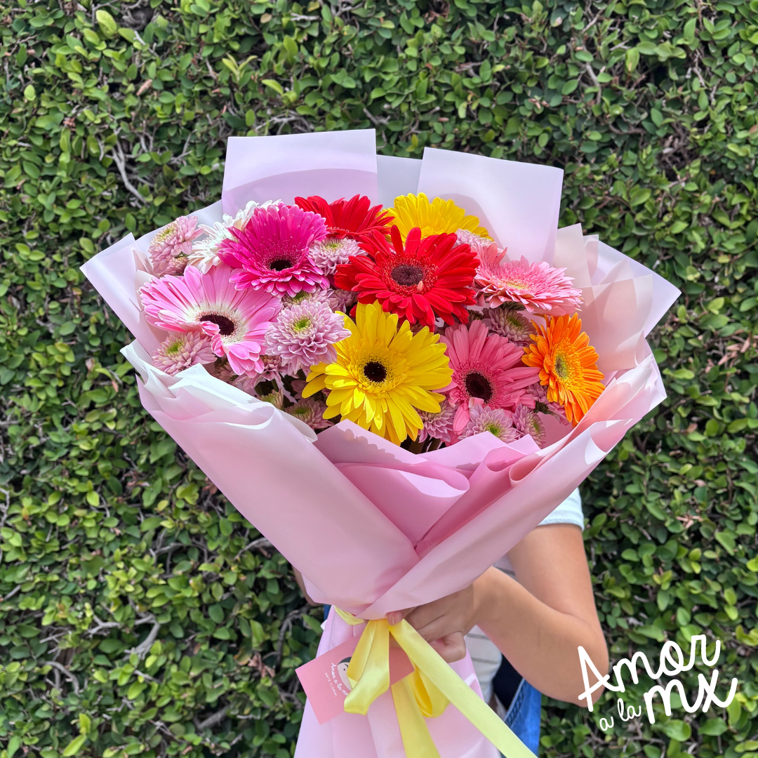 Ramo de 10 gerberas con margaritas envuelto en papel decorativo.